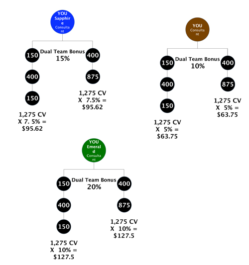 Qualified Gold Pack Representatives, Sapphires and above can earn up to 20% of the lesser sales team CV. 100 PQV per month minimum.