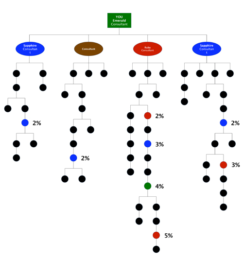 Ranks are earned based on your team structure and volume. To clear this up ahead of time, you will see that certain aspects of the ranks are subject to a 30% rule or a 40% rule. This means no more than 30% or 40% of the volume needed to earn the rank can come from one leg. A simple example is Sapphire, whose qualifying volume is $14,000. This rank is subject to the 40% rule. Therefor, no more than 40% of $14,000 ($5,600) in volume can come from any one leg to qualify you. Why would this matter?